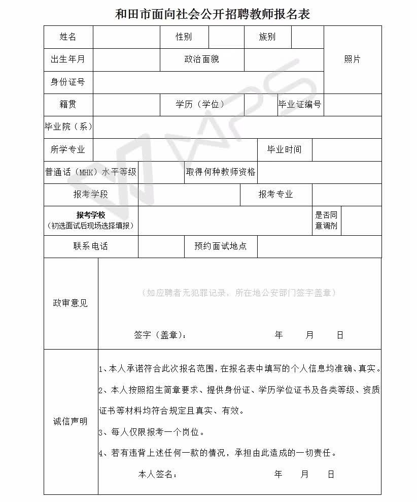 1.现场报名:应聘者可自行下载报名表(政审表、承诺书),填写好后在报名当日上交至和田市招聘。